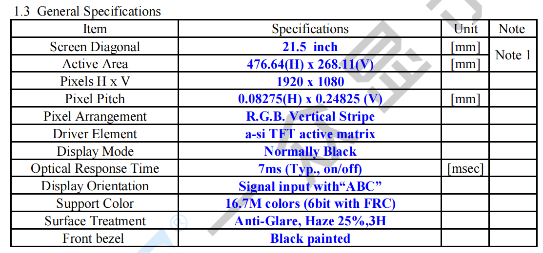 The specification is applied to 21.5” model TST215FHHT-DC1 using HKC Opencell in design.
